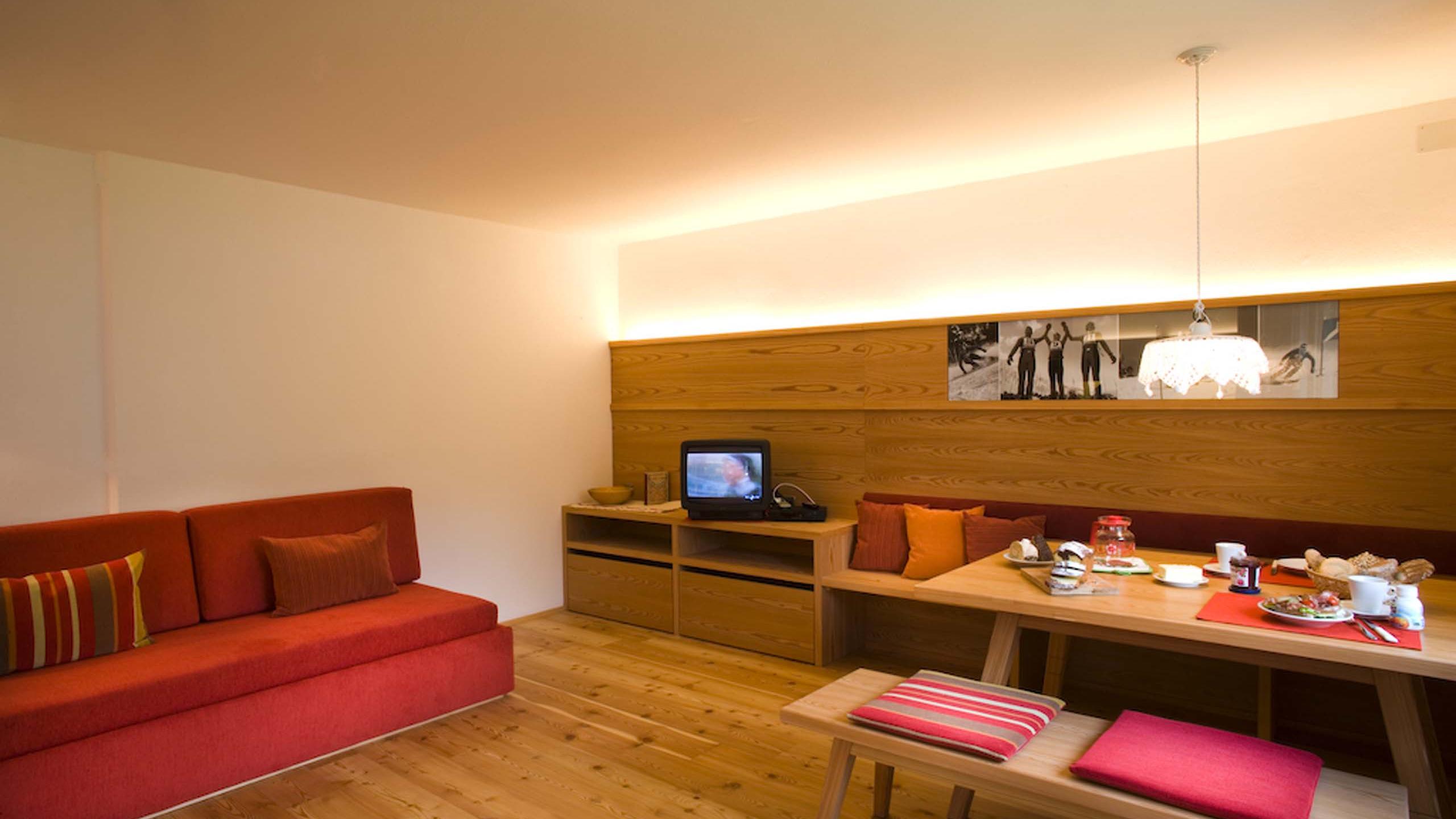 Neu renovierte Ferienwohnung für vier bis fünf Personen, bestehend aus zwei Doppelzimmern und einer großen Wohnküche mit Bergpanoramablick und Sofa. Sehr sonnig gelegen mit direktem Gartenzugang. Die Wohnung ist ausgestattet mit Naturholzmöbeln. Die Küche verfügt über einen Geschirrspüler und Mikrowellenherd. Das Badezimmer ist mit Dusche, Bidet, Waschbecken, Föhn und Pflegeprodukten ausgestattet, ein separates WC ist vorhanden, ebenso Safe und SAT-TV.