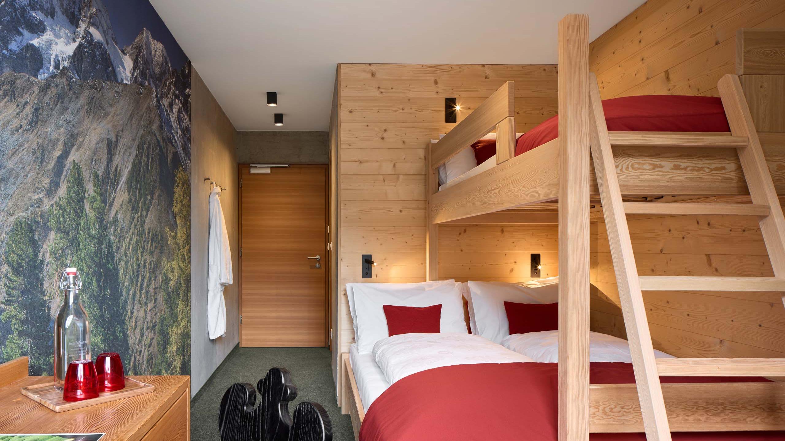 Unser Dreibettzimmer, modern und nachhaltig eingerichtet, verfügt über ein französisches Bett und darüber ein Einzelhochbett. Warme Holzelemente aus Fichte und Lärche sowie andere hochwertige Materialien verleihen dem Zimmer einen angenehmen Wohnkomfort. Große, weite Fenster erlauben wunderschöne Blicke in den Nationalpark Stilfserjoch.