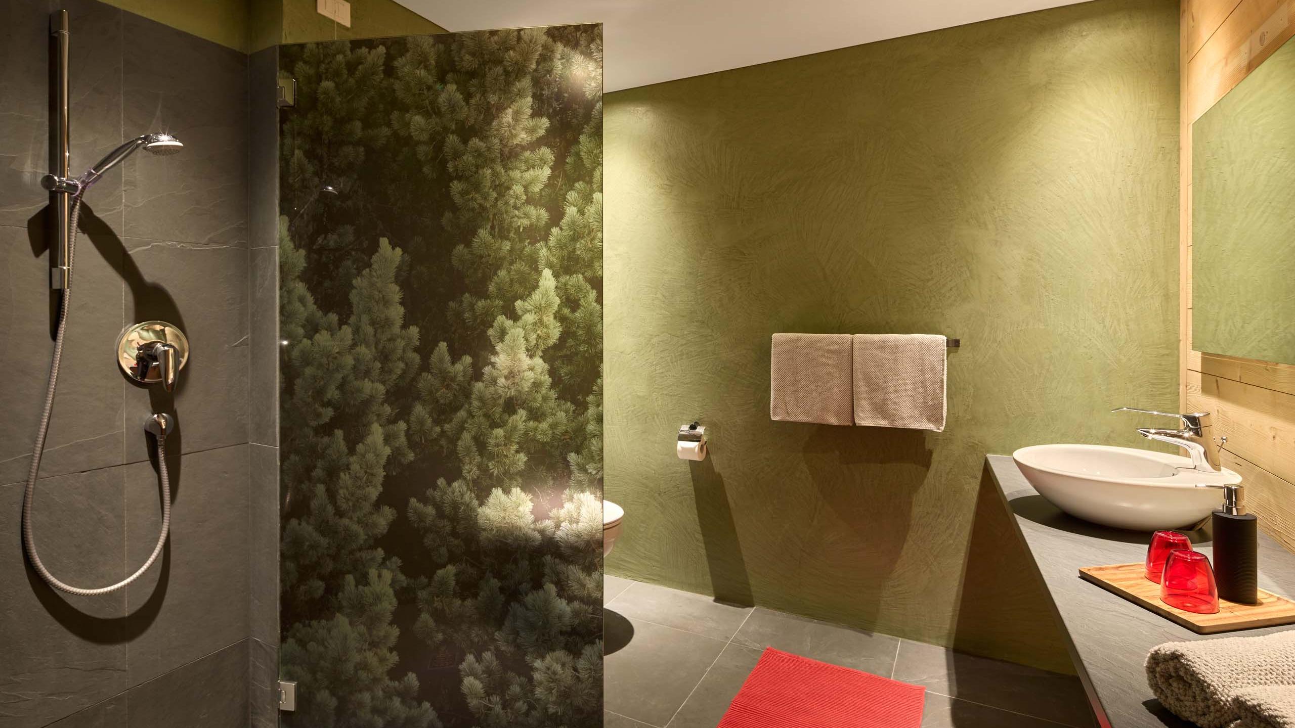 Das komfortable Badezimmer beinhaltet eine geräumige Dusche, ein WC, einen Föhn und frisches Bergquellwasser aus dem Wasserhahn.