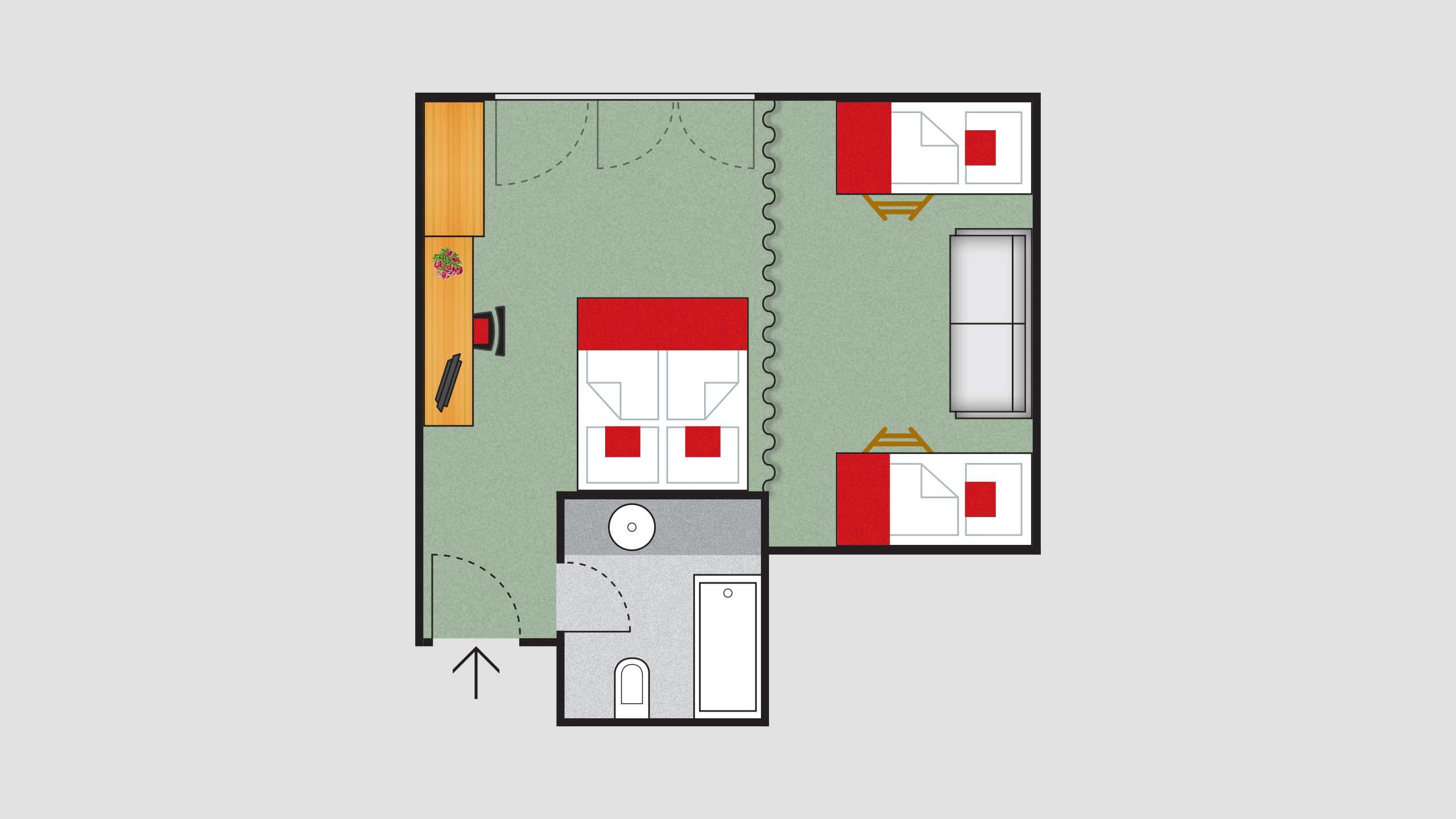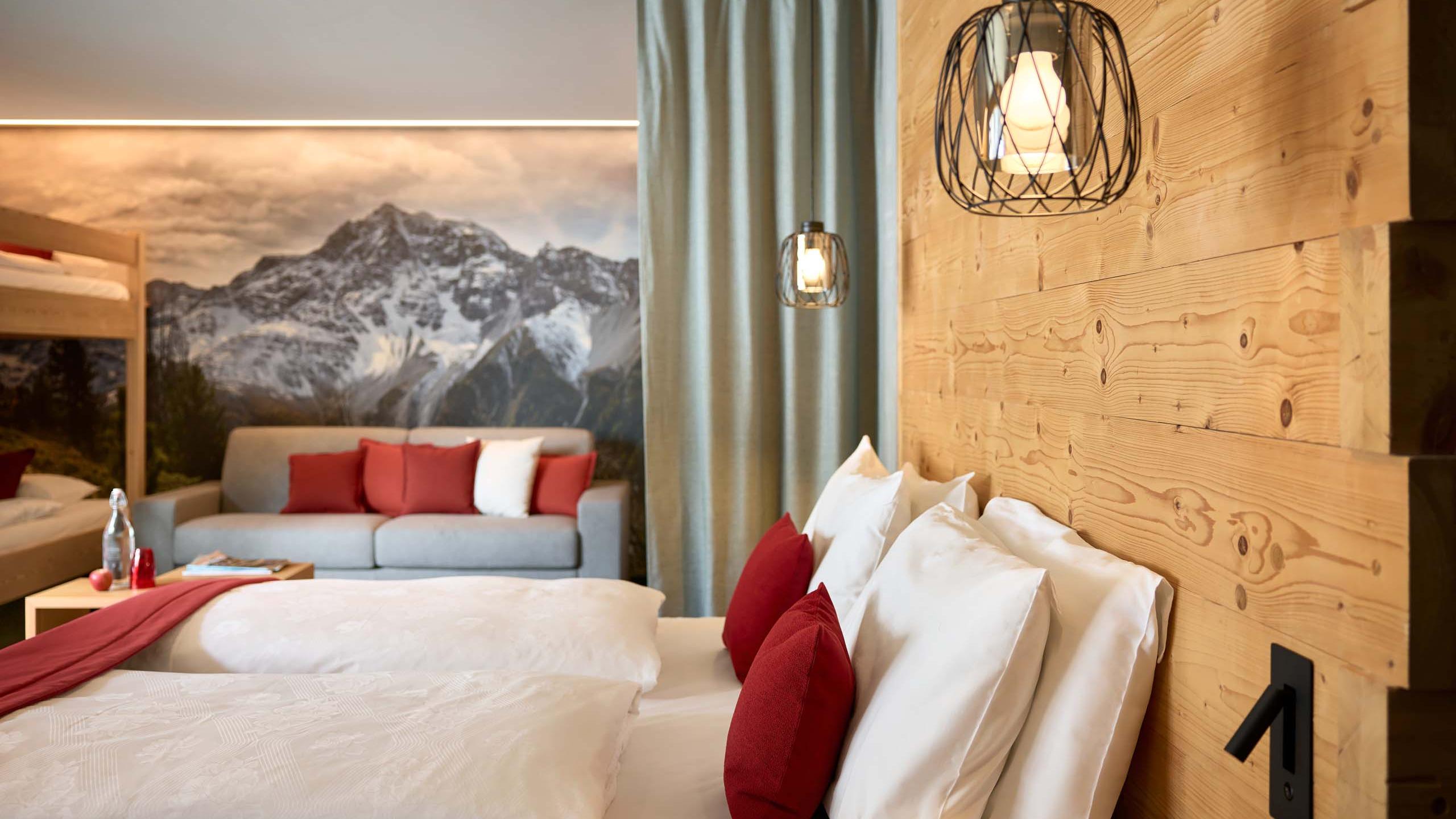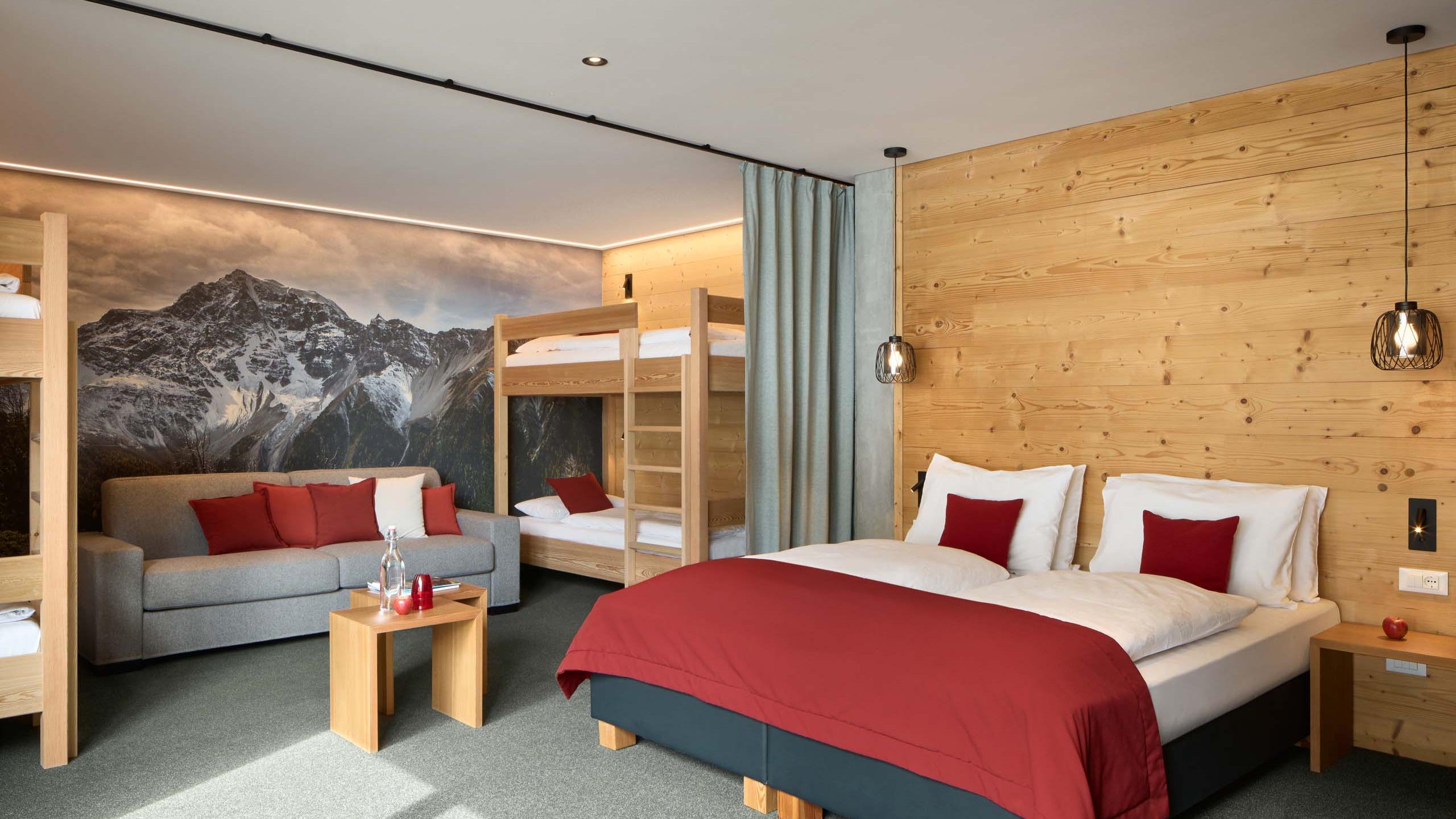 Unsere Familiensuite mit Platz für bis zu sechs Personen verfügt über ein Doppelbett, zwei mit Vorhang abgetrennte Stockbetten und ein Schlafsofa. Warme Holzelemente aus Fichte und Lärche sowie andere hochwertige Materialien verleihen dem Zimmer einen angenehmen Wohnkomfort. Große, weite Fenster bieten wunderschöne Blicke in den Nationalpark Stilfserjoch.