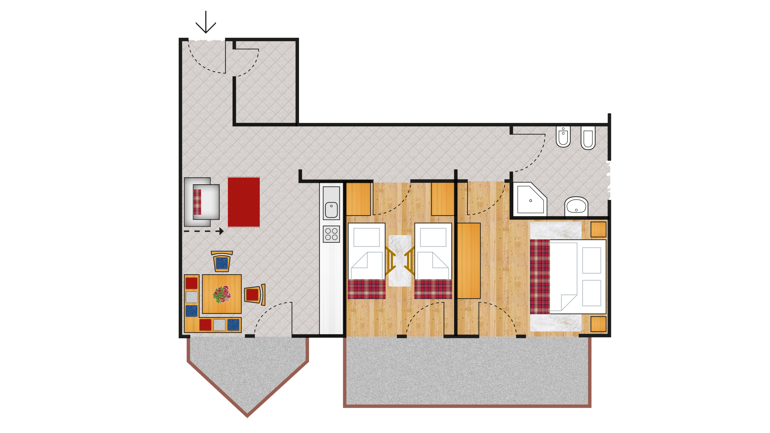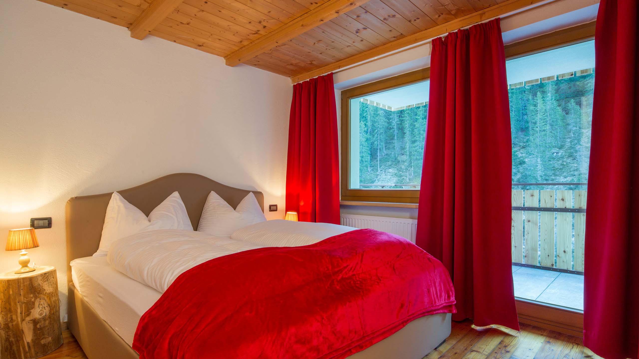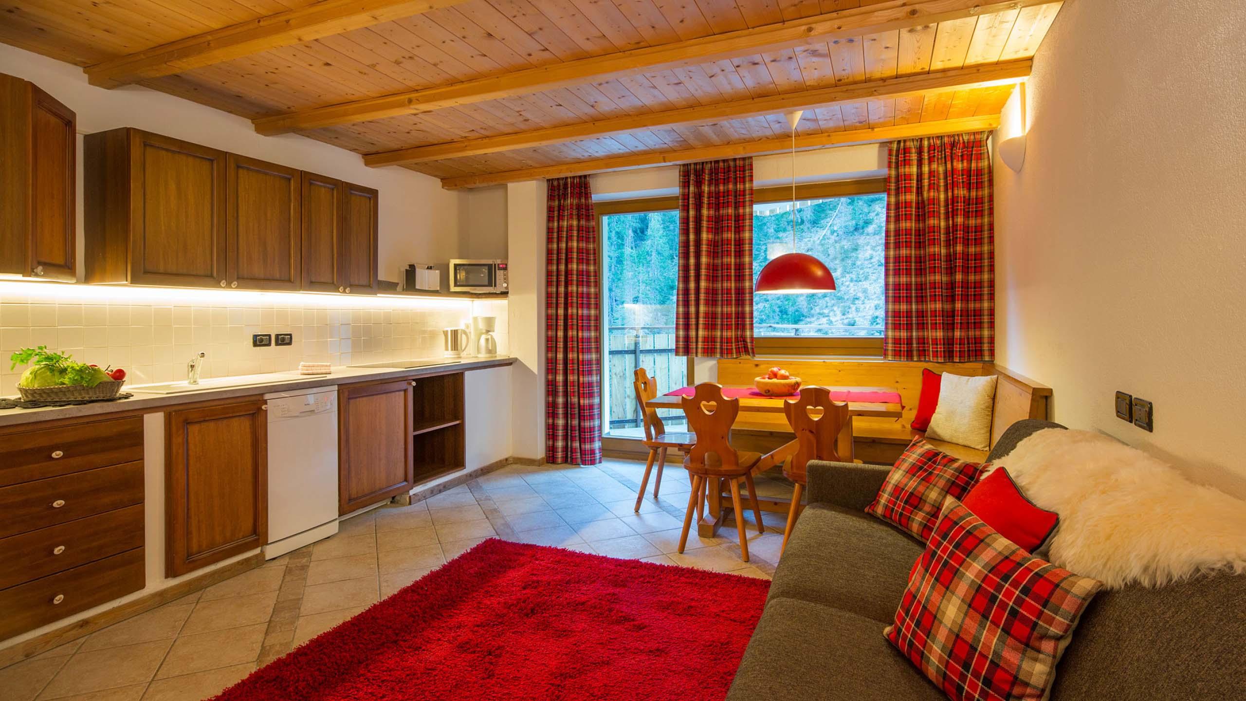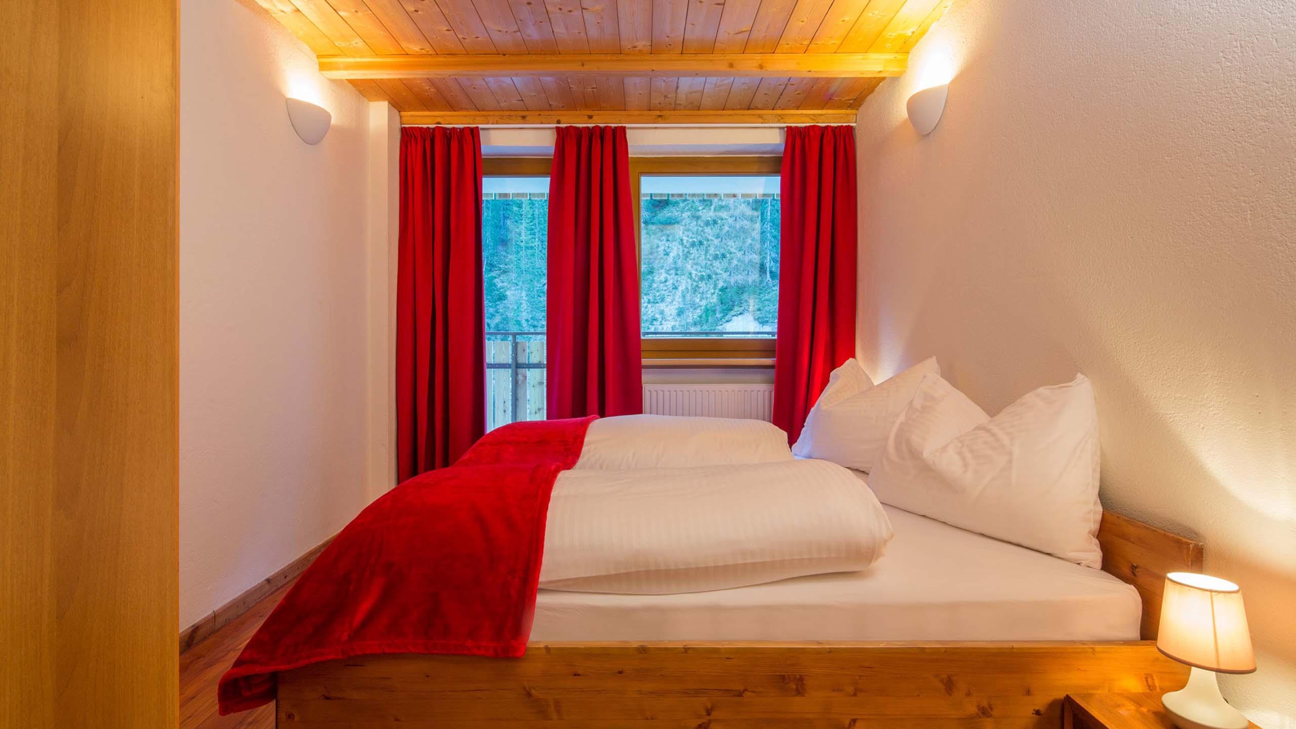 Gemütliche Wohnung im Tiroler Stil für vier bis acht Personen mit zwei großen Panoramabalkonen zur Bachseite. Bestehend aus einer großen Wohnküche mit Schlafsofa, Eckbank, SAT-TV, Küchenzeile und zwei Schlafzimmern: eines mit Doppelbett und eines mit zwei Betten und bei Bedarf Zustellbett, geräumiges Badezimmer mit Dusche, WC und Bidet.